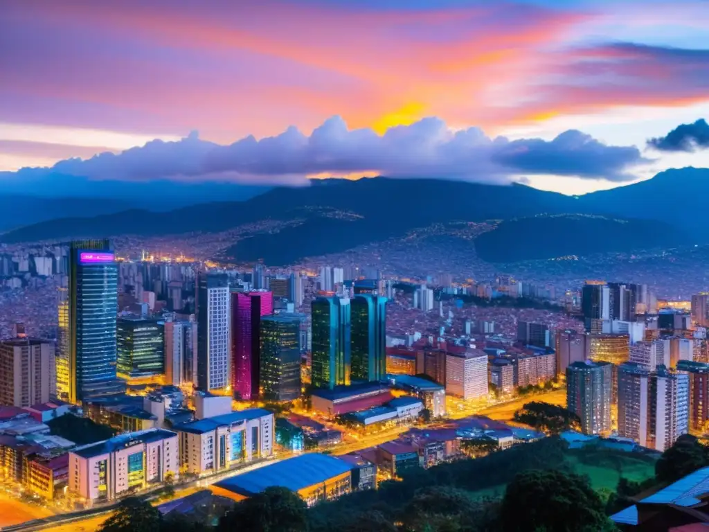 Vibrante ciudad colombiana con rascacielos modernos y montañas verdes