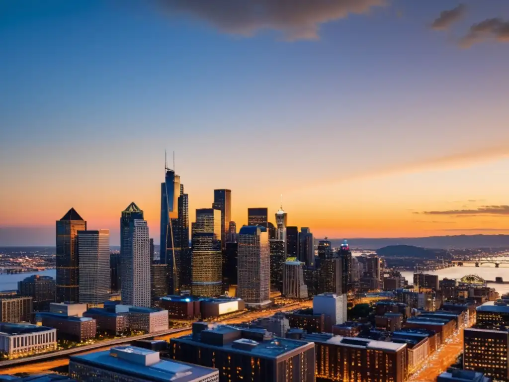 Vista panorámica de una ciudad vibrante al atardecer, con rascacielos modernos iluminados