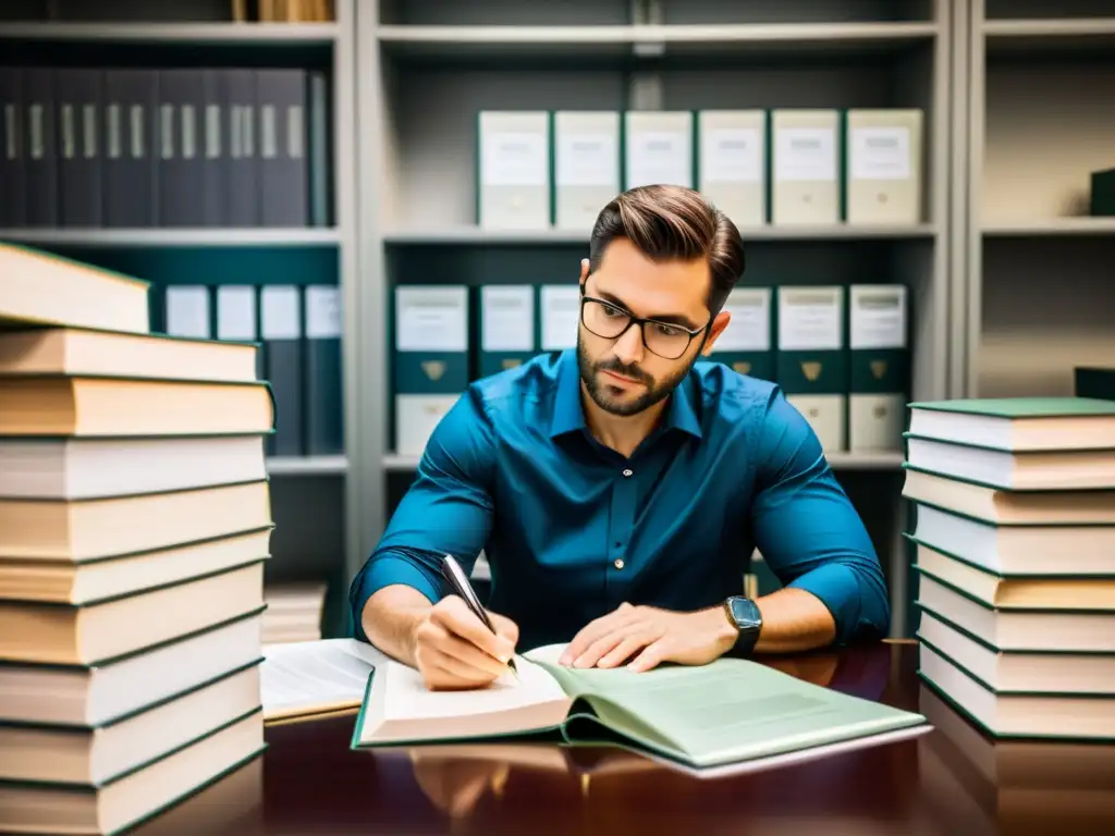 Experto en planificación fiscal examina detalladamente libros de leyes y documentos financieros en moderna oficina
