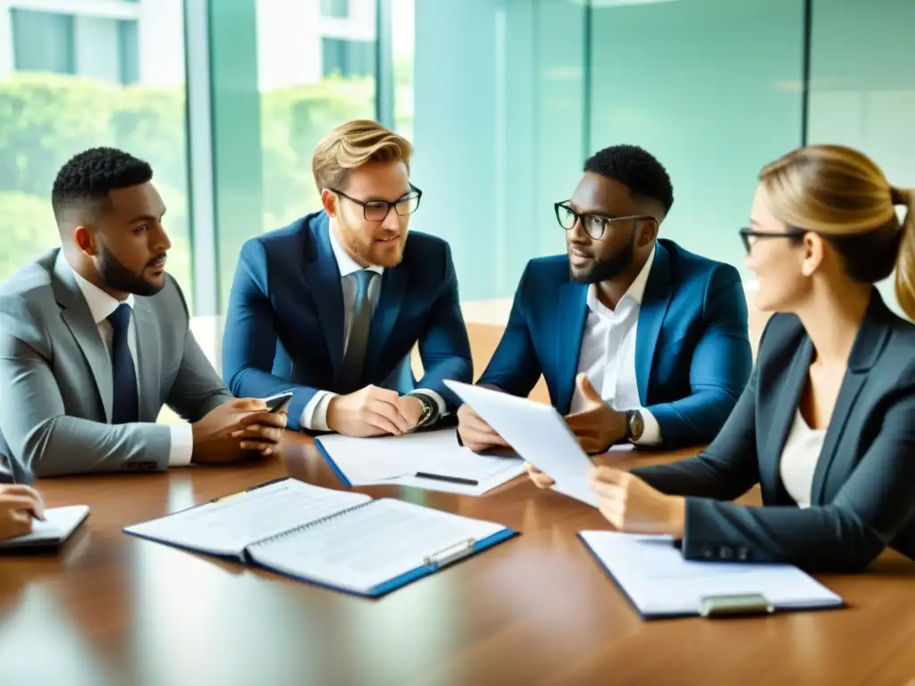 Un equipo de profesionales del derecho tributario en una oficina moderna, colaborando y compartiendo conocimientos sobre regulaciones financieras