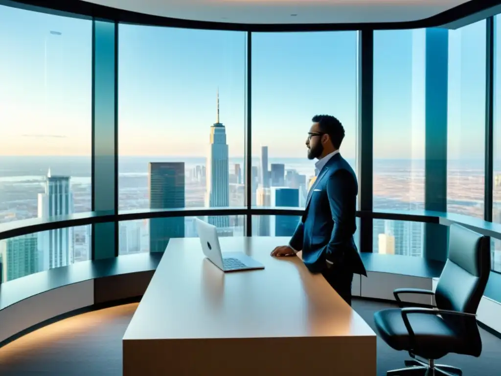 Oficina moderna con eficiente planificación fiscal, bañada en luz natural, simbolizando éxito y crecimiento