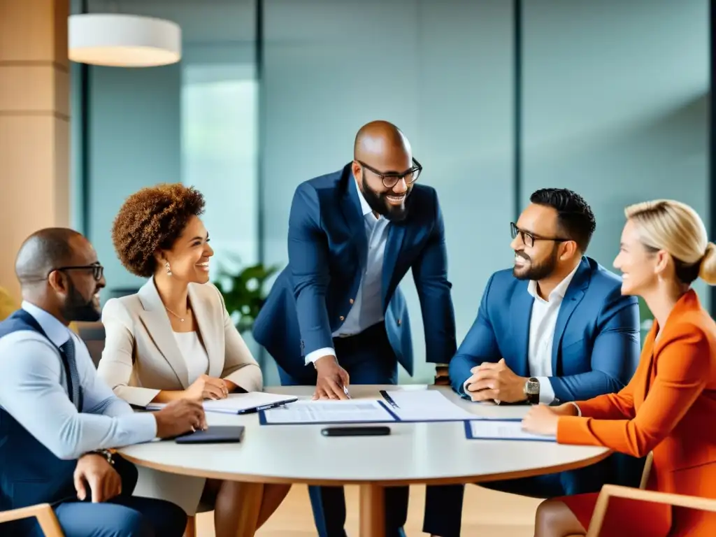 Profesionales en consultoría fiscal para planificación sucesoria discuten en una sala de conferencias moderna y elegante, iluminada por luz natural